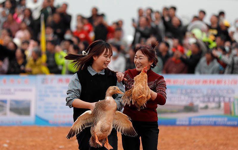 趣味竞技获奖的两位村民抱着鸡鸭喜笑颜开。卢文斐摄